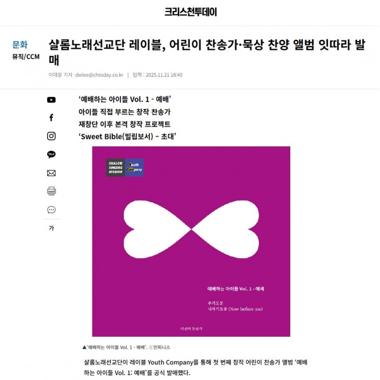 뮤직타임 [기사] 샬롬노래선교단 레이블, 어린이 찬송가·묵상 찬양 앨범 잇따라 발매(크리스천투데이)