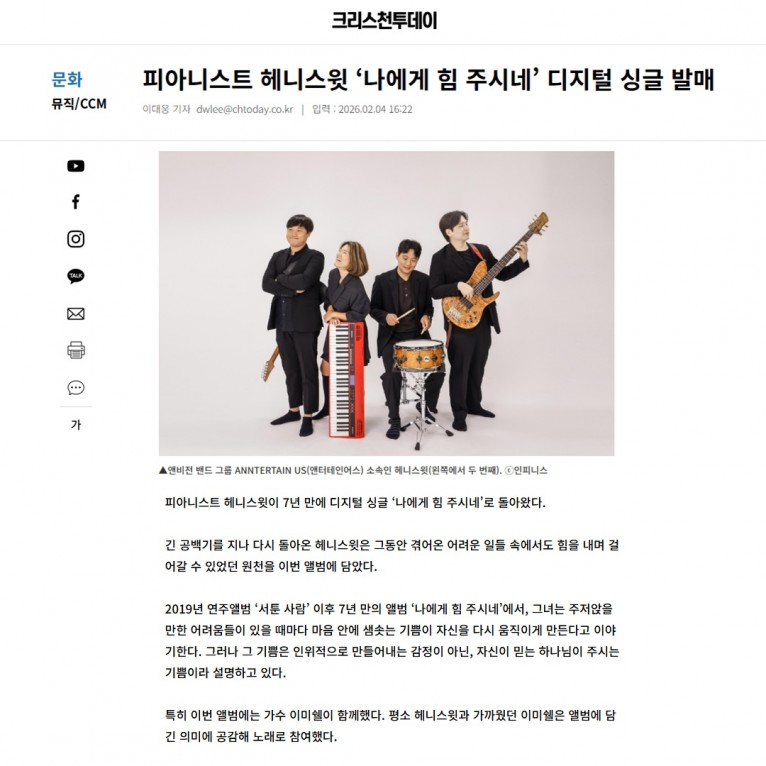 [기사] 피아니스트 헤니스윗 ‘나에게 힘 주시네’ 디지털 싱글 발매(크리스천투데이)